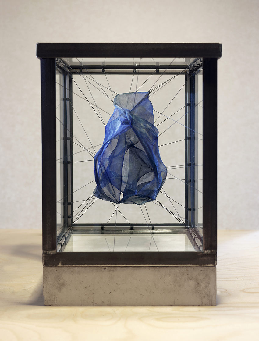 Adam Jeppesen, Work no. 186, from the series Tank, 2025, Mixed media (cyanotype on silk, stretched with flax string, suspended in white oil), 38,5 x 38,5 x 31,5 cm