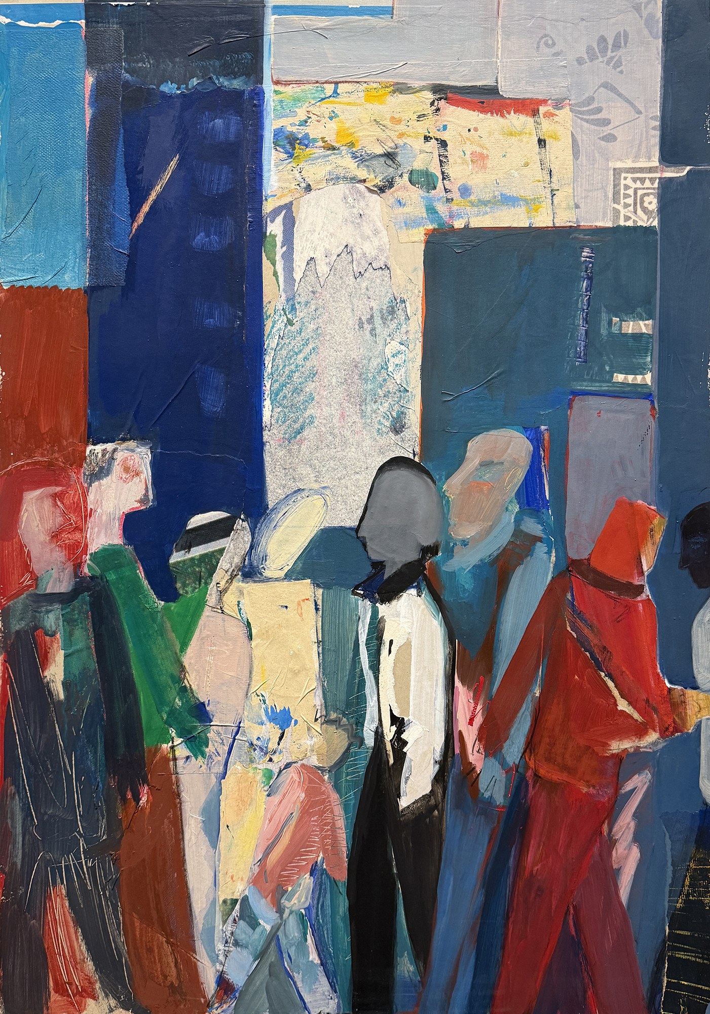 Irmgard Merkens, Menschen, 1998, Collage, mixed media, card board, 140 x 80 cm