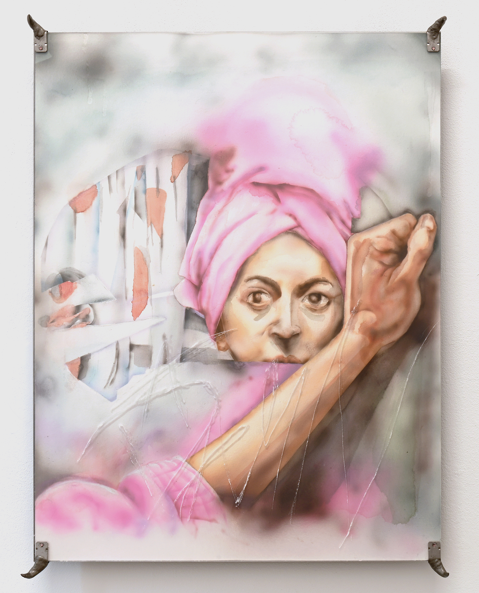 Lena Mai Merle, A DAMN (from the series Grand Theft), 2025, Watercolour and airbrush on Hahnemühle paper, acrylic glass, foil, window frost on Alu-Dibond, Ca. 56 x 46 cm, 1800 €