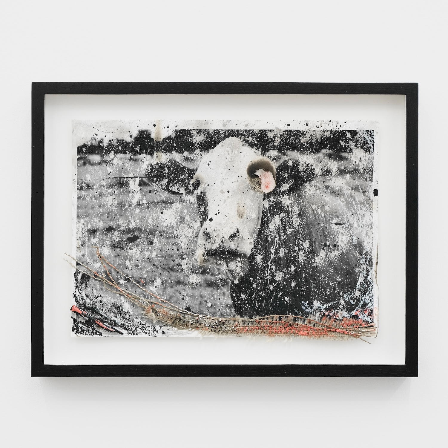 Norman Maýn, Untitled (00 509), 2025, Inkjet print, graphite, coal, acrylic, wood, ink, soot, sand, bandage, textiles on matte fibre paper, Framed, Unique, 36,8 x 28 cm, 900 €