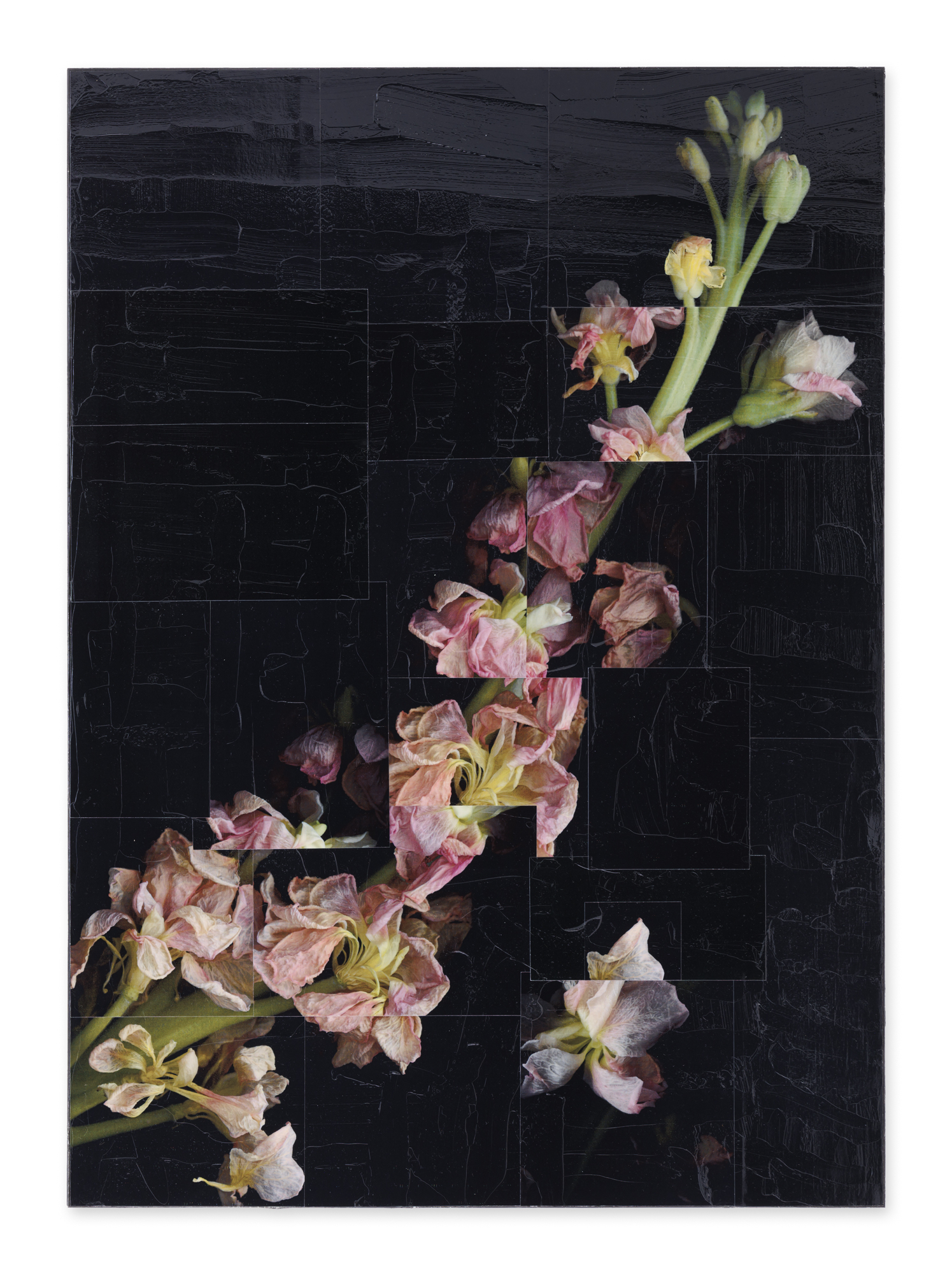 Andrea Esswein, Lachs-Rose Blume, 2023, Copy Collage, paper on wooden board, lacquer, unique piece, 70 x 50 x 3,5 cm, 3.600,- EUR, Foto: Nikolaus Fürcho, courtesy: mianki.Gallery