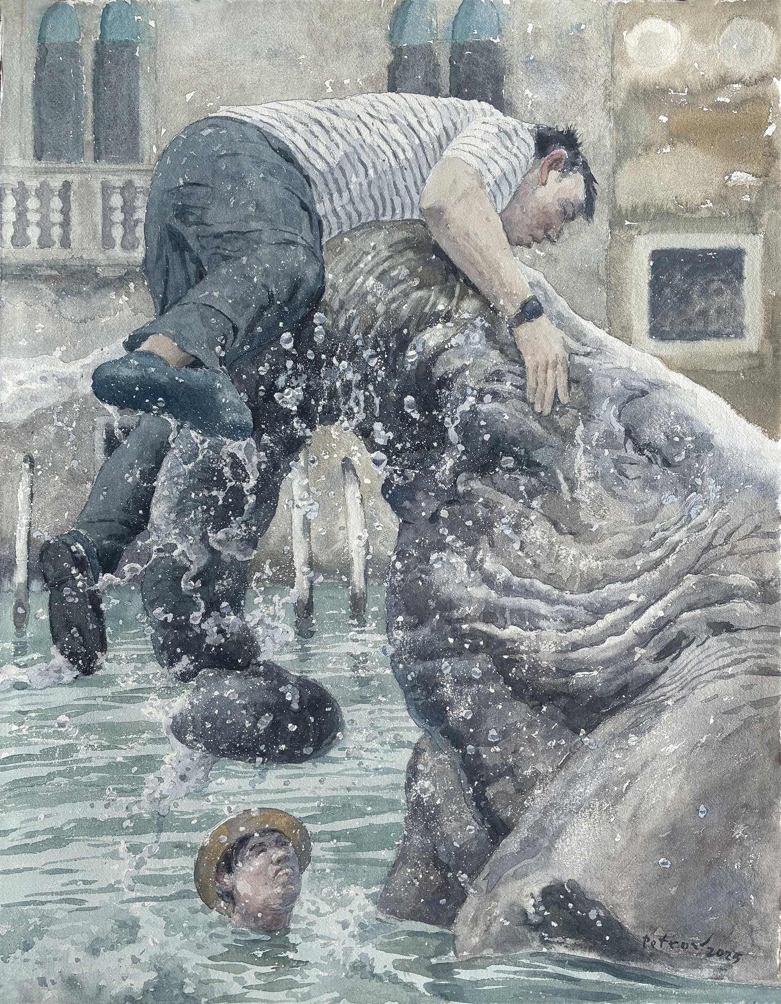 Ievgen Petrov, Conflict with the gondoliers, 2025, watercolour on paper, 65 x 51 cm, 4000, Unique