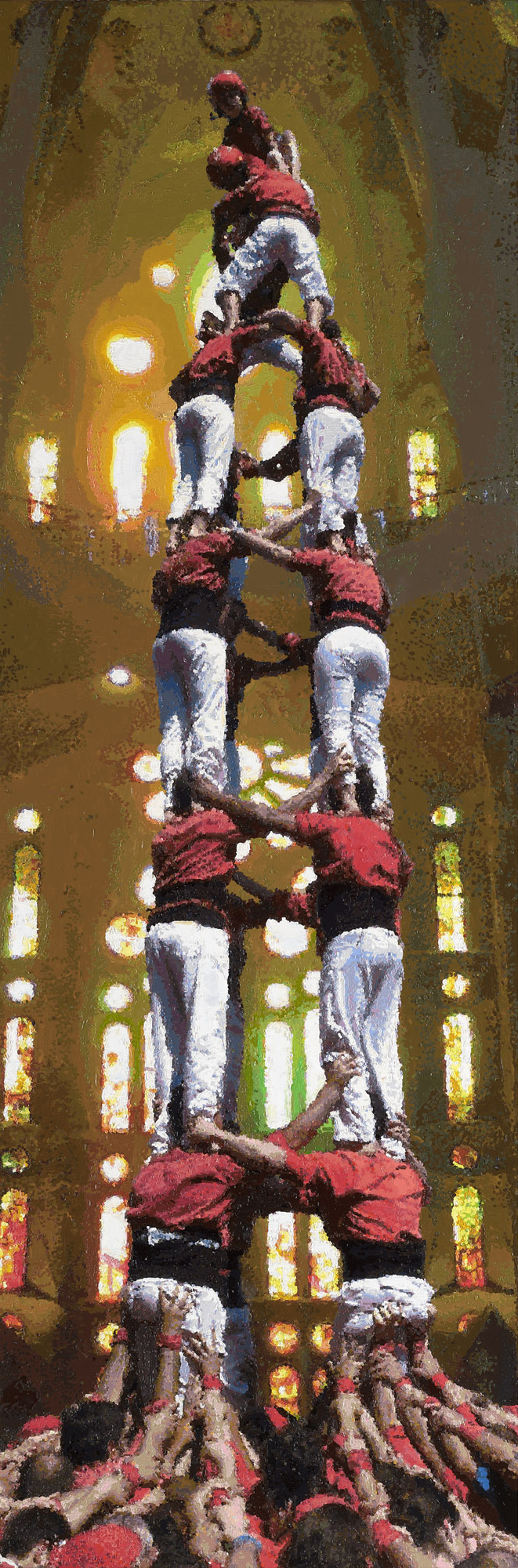 Römer + Römer, Castellers en la iglesia de Sagrada de Familia de Antonio Gaudí, 2022, oel on canvas, 240 x 80 cm, 16000